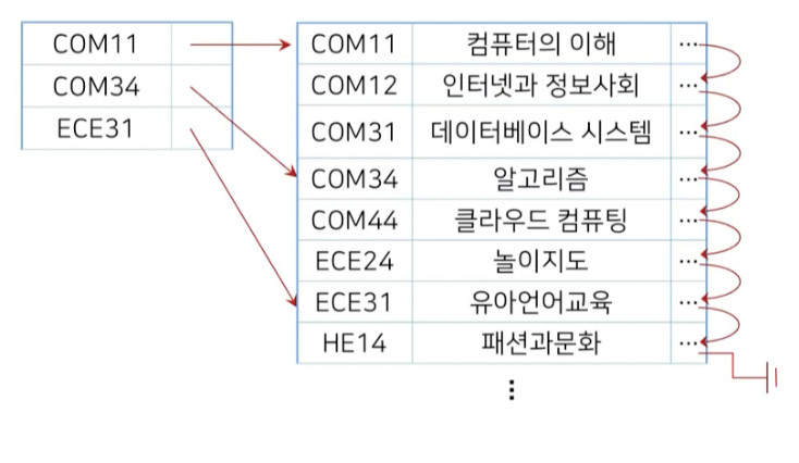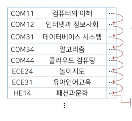 밀집 인덱스 예시 이런 형태의 과목 테이블이 순차파일 형태로 구성되어있다.